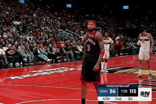 中場休息回來,猛龍進攻端火力大幅飆升,他們第三節比第二節足足多得到22分,瘋狂轟下兩隊本場唯一一次單節45+得分。奇才完成本場首次單節30+,但猛龍借助團隊攻勢一邊倒碾壓奇才,前三節比賽猛龍已經5人得分14+,巴雷特21+6、英格拉姆19+7+6、巴恩斯19分、奎克利15分與馬穆14+8,奇才僅兩人得分上雙,麥科勒姆18分與約翰遜14分。猛龍第三節48-30凈勝18分,三節比賽結束猛龍擴大105-77領先奇才。