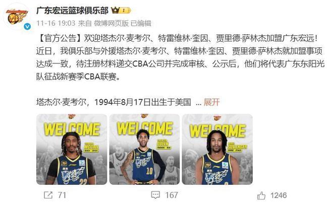 早在11月16日,廣東隊一口氣官宣瞭3名外援,分別是上賽季效力於廣州龍獅隊的塔傑爾-麥考爾、上賽季效力於北控男籃的賈裡德-薩林傑,還有上賽季在NBA魔術隊打球的特雷維林-奎因。這個休賽期廣東隊放棄瞭上賽季的全部四名外援,已經確定的三名外援都是很有實力的,其中奎因上賽季還是NBA魔術隊的主要輪換,麥考爾和薩林傑也經過CBA球隊的考驗,球隊的整體實力較上賽季有瞭很大的提升。