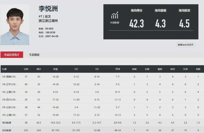 終於到瞭本屆全運會,李悅洲的進攻火力再也隱藏不瞭,他在預賽階段就場均拿下20.2分6.2籃板6助攻,率領浙江U18男籃順利打進決賽階段。