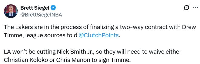 目前湖人隊的三個雙向合同名額已被小尼克-史密斯、克裡斯蒂安-科洛科以及克裡斯-馬農占據。Siegel獲悉,小尼克-史密斯不會成為被裁撤的人選,因此球隊大概率會解雇科洛科或馬農中的一人,為蒂米騰出陣容名額。