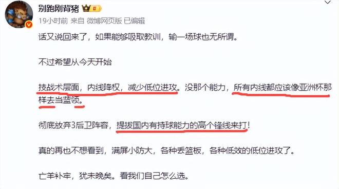 別跑背剛豬說,在技戰術層面,內線降權,減少低位進攻。沒那個能力,所有內線都應該像亞洲杯那樣去當藍領。