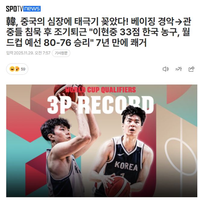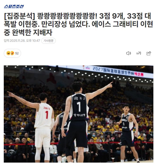賽後多傢韓國媒體都為韓國男籃發來賀電:李賢重單場9個三分球大爆發,韓國隊時隔七年重新越過中國長城,完美的一場勝利。