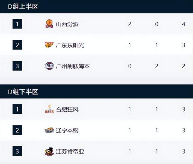 D組上半區,山西男籃2戰2勝,排名第1,廣東男籃1勝1負,排名第2,廣州男籃0勝2負,排名墊底。D組下半場,合肥狂風男籃1勝1負,排名第1,遼寧男籃1勝1負,排名第2,江蘇男籃1勝1負,排名第三。