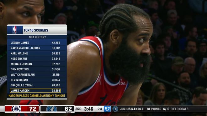 麥克丹尼爾斯在第三節開始後不久找到得分感覺連拿9分,蘭德爾三分中的,森林狼隊追至57-62。祖巴茨空接扣籃還擊,麥克丹尼爾斯打3分成功,哈登連投帶罰拿下4分率隊打出8-1的攻擊波,快船隊穩住局勢。哈登的生涯總得分這時達到28292分,超越卡梅羅-安東尼升至歷史第10位。森林狼隊再次反攻又追5分,哈登和巴圖姆各拿3分,康利三分中的,克拉克打3分成功,三節結束時森林狼隊以72-78落後6分。