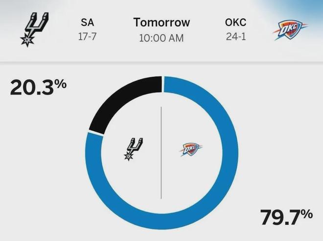 話說ESPN並不看好擁有文班亞馬的馬刺,可以戰勝幾乎不可擊敗的雷霆,兩隊勝率預測如下: