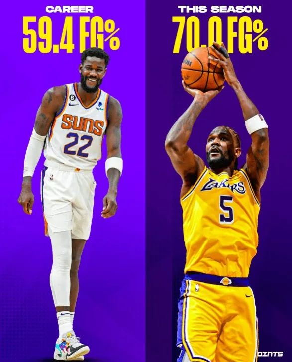 要知道,即便是“天勾”賈巴爾,其湖人時期投籃命中率最高的一個賽季為60.4%;即便是最具統治力的“大鯊魚”奧尼爾,其湖人時期命中率峰值是60.0%;即便是在現代籃球中同樣以高效著稱的安東尼·戴維斯,其單賽季最高命中率也未超過55.0%。