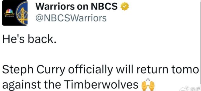 如今庫裡將在對陣森林狼的比賽迎來復出,他已經從球隊的傷病名單消失。庫裡對於自己的狀態表示:“我現在感覺非常好,對於明天出戰比賽,我相當樂觀。”
