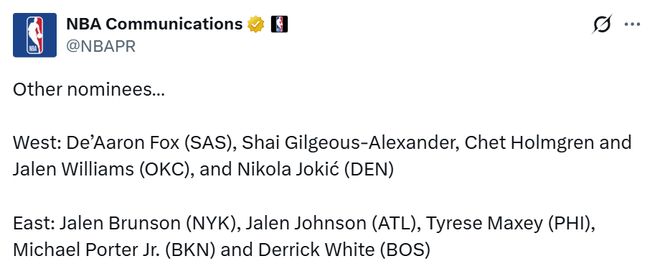 西部:福克斯(馬刺)、亞歷山大、霍姆格倫、傑倫-威廉姆斯(雷霆)、約基奇(掘金)