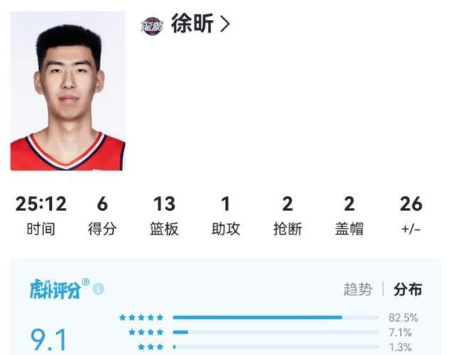 不但能護筐,徐昕還送出瞭一記助攻,2次搶斷,2次蓋帽,另有1失誤2犯規,正負值+26,全隊第一。如此勇猛的徐昕,真是叫人刮目相看瞭。