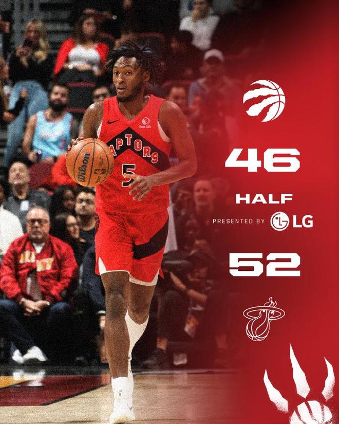 次節比賽,熱火首次單節轟下30+得分,且限制猛龍連續兩節不足25分,熱火內外開花率先一波14-2攻勢,成功以36-25反超11分。猛龍回敬一波13-2攻勢追到38-38,雙方隨後持續拉鋸戰纏鬥至43-43,熱火打出一波9-3攻勢取得領先,上半場比賽結束熱火52-46反超猛龍。前兩節比賽,猛龍三分23中9,英格拉姆9中5得到18分;熱火三分19中7,鮑威爾11分與阿德巴約13+9。