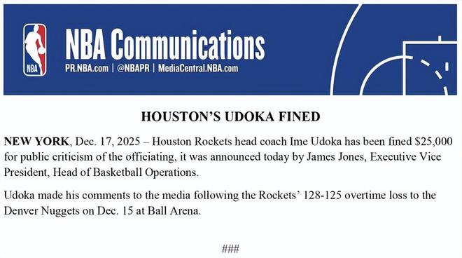 北京時間12月18日,NBA官方公佈罰單,休斯頓火箭隊主教練烏度卡因在周二球隊加時惜敗丹佛掘金隊後公開抨擊裁判判罰,被聯盟處以25000美元罰款。