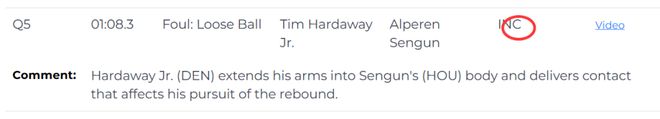 盡管掘金隊當晚的總犯規數(28次)多於火箭隊(25次),但聯盟出具的該場比賽最後兩分鐘裁判報告顯示,在加時賽最後兩分鐘內出現的三次錯判,最終均對掘金隊有利。