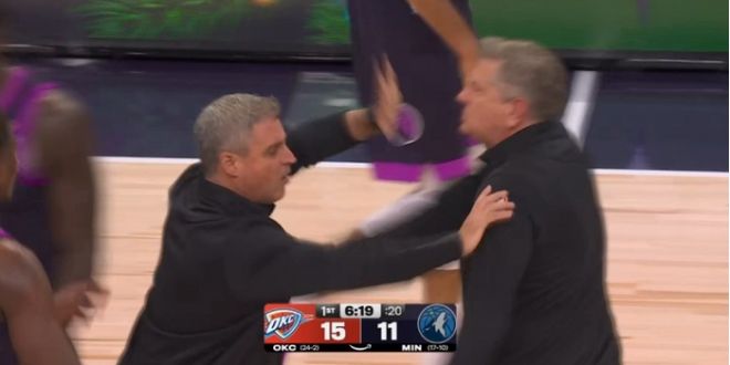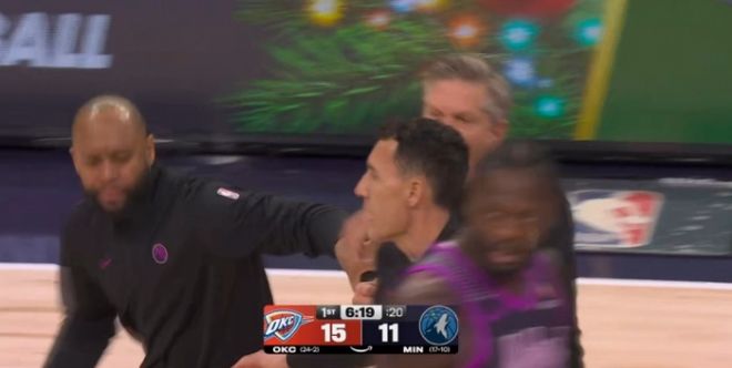 在首節比賽進行到還剩6分19秒時,愛德華茲此前反擊上籃不中,蘭德爾搶到籃板,但被傑倫給搶走球權。此時,森林狼主帥芬奇極為不滿,他認為此前愛德華茲的上籃應該給哨,而裁判沒有任何吹罰。