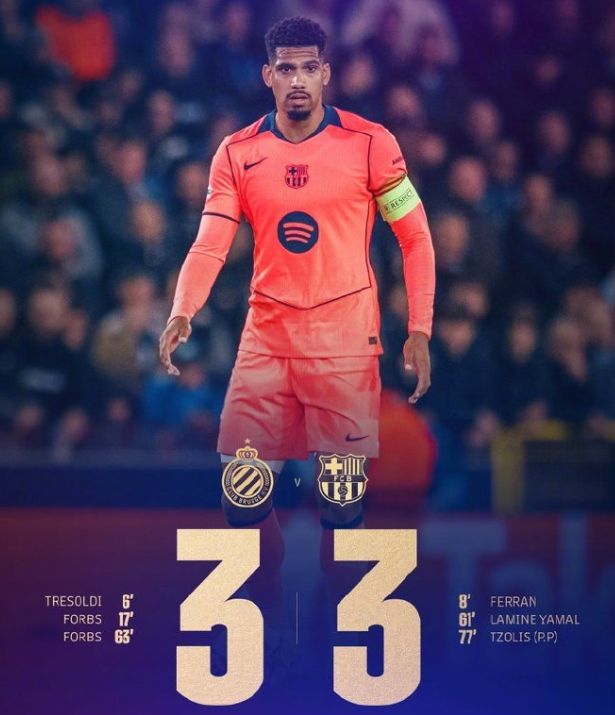 易边再战,第61分钟,场上迎来精彩配合,亚马尔在弧顶外得球后突破重围,与费尔明完成撞墙配合,接到后者回做后,禁区内外脚背低射远角破门,巴萨2-2再度扳平比分。第64分钟,瓦纳肯断球后送出精准斜塞,博尔赫斯再次前插获得单刀机会,以一记轻巧的挑射攻破什琴斯尼的十指关,完成梅开二度的同时,帮助布鲁日3-2第三次取得领先。