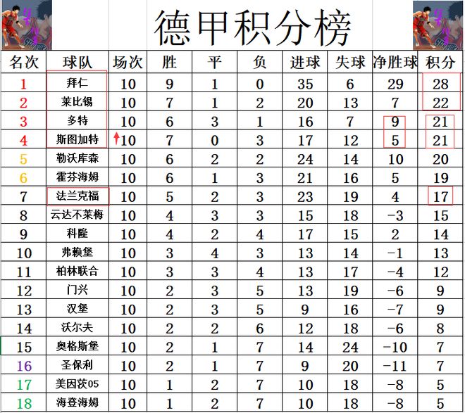 德甲最新积分战报 斯图加特逆转差拜仁7分 法兰克福4轮不败升第7