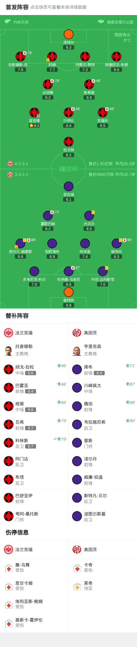 第80分钟,堂安律右路突破两人防守,小角度推射破门,法兰克福1-0