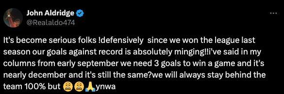 約翰-奧爾德裡奇表示:“事情已經變得嚴重瞭,各位!自從我們上賽季贏得聯賽冠軍以來,從防守的角度看,我們的丟球紀錄絕對糟糕!”他提到,如今利物浦在聯賽中已經丟瞭20球,這是球隊眼下面臨的最大問題。