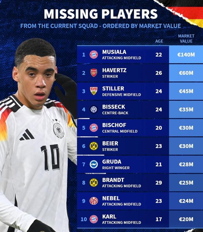 北京时间11月15日,德国队在世预赛欧洲区A组倒数第二轮的比赛中客场2-0战胜了卢森堡,末轮主场面对斯洛伐克只要保持不败他们就能晋级2026年世界杯。与此同时,德转则统计出了此次未能入选德国队大名单身价最高的10位球员,穆西亚拉领衔,哈弗茨、施蒂勒、比塞克、比朔夫、拜尔、布兰特以及伦纳特-卡尔在列。