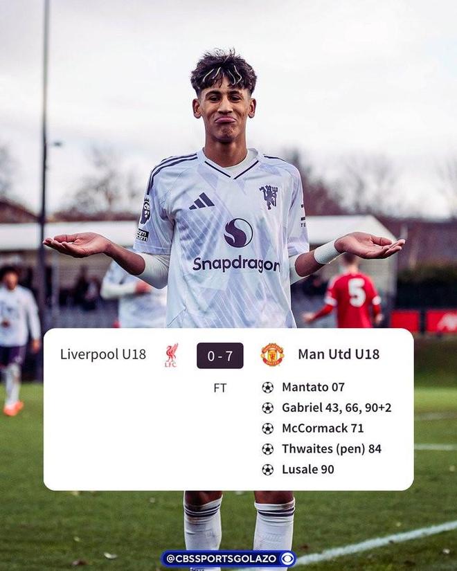 在本周六進行的U18英超聯賽中,曼聯U18客場7-0大勝利物浦U18,其中15歲小將JJ-加佈裡埃爾完成帽子戲法。