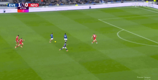第45+3分鐘,埃弗頓前場三打一,恩迪亞耶助攻巴裡破門,埃弗頓2-0森林