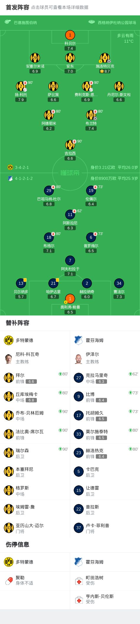 第43分钟,打破僵局,扬-科托助攻布兰特破门,多特1-0霍芬海姆
