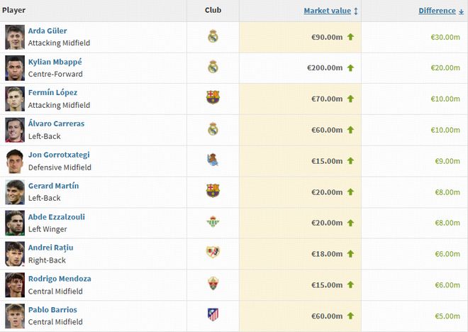 北京时间12月12日,德国转会市场网站更新了西甲身价,新一期的身价涨幅榜也随之产生,居莱尔上涨3000万欧,姆巴佩上涨2000万欧。