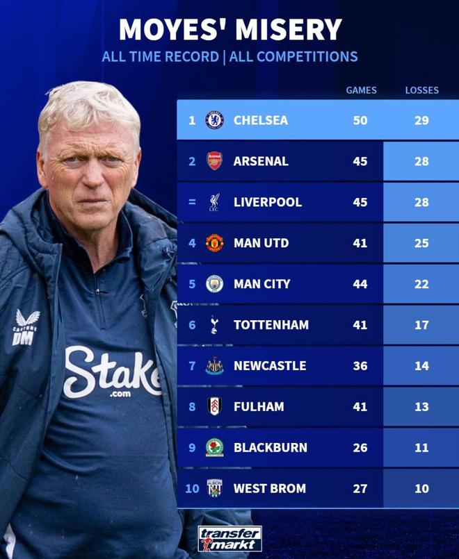 賽後來自德轉的統計指出,這是莫耶斯教練生涯至今帶隊各項賽事50次對陣切爾西吃到的第29場敗仗,藍軍也超越阿森納和利物浦(28負)成為瞭這位蘇格蘭教頭教練生涯至今輸球場次最多的對手。