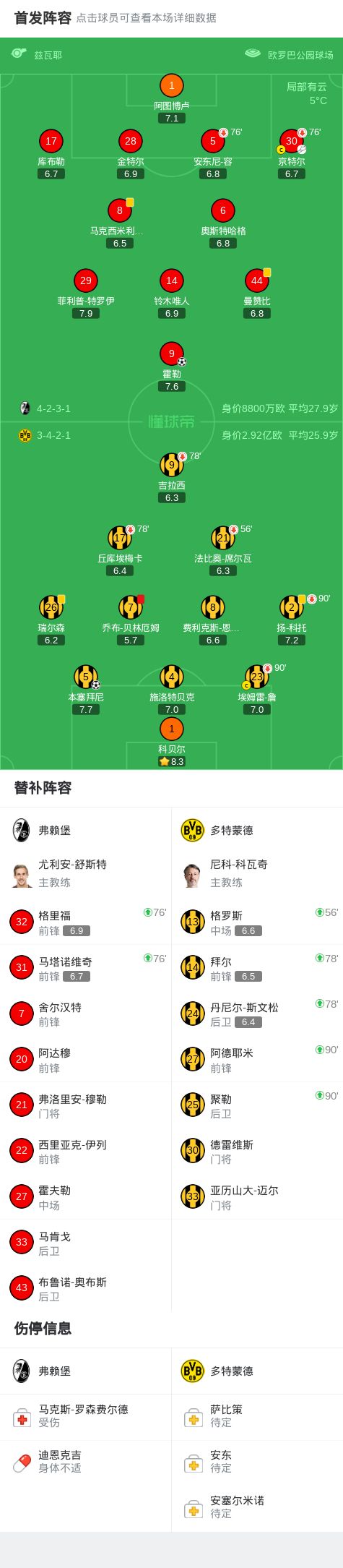 第75分钟,霍勒潇洒转身凌空卧射破门,弗赖堡扳平比分,1-1