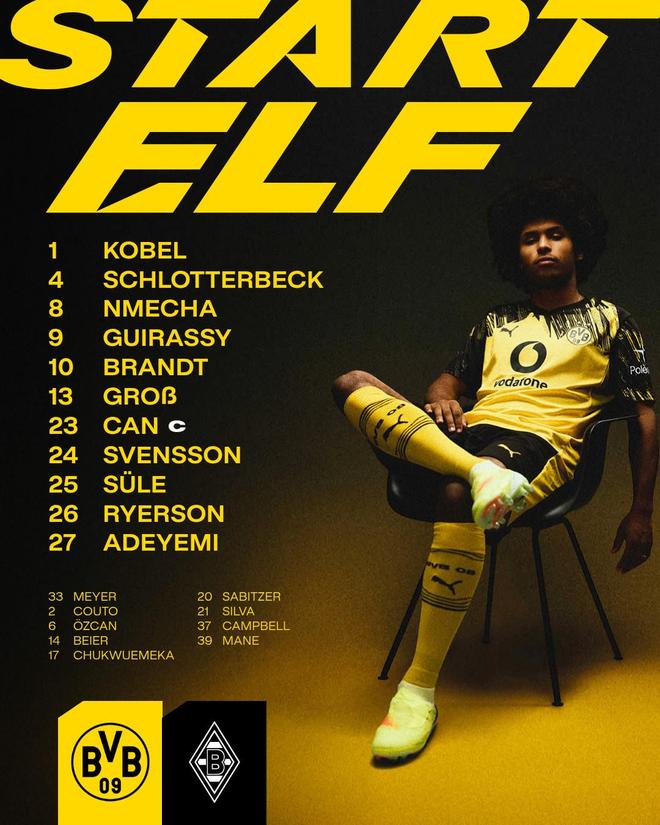 门兴首发:33-尼古拉斯、4-迪克斯、30-埃尔维迪、29-斯卡利、20-内茨、27-赖茨、13-雷纳、10-诺伊豪斯、6-恩格尔哈特、16-桑德尔、15-塔巴科维奇
