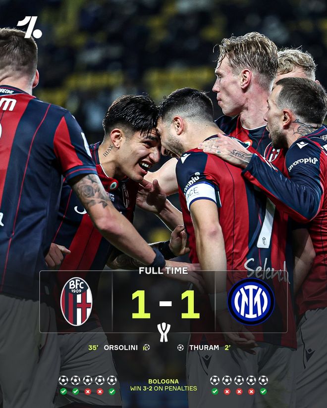 北京時間12月20日03:00,意大利超級杯半決賽,博洛尼亞對陣國際米蘭,比賽在沙特國王大學體育場進行。上半場,小圖拉姆2分鐘閃擊建功,比塞克手球送點,奧爾索裡尼點射建功,貝納德斯基傷退。易邊再戰,VAR取消國米點球。最終常規時間國米1-1博洛尼亞直接進入點球大戰。點球大戰國米巴斯托尼、巴雷拉、博尼失點。最終博洛尼亞常規時間1-1,點球大戰3-2國米晉級決賽,將對陣那不勒斯。