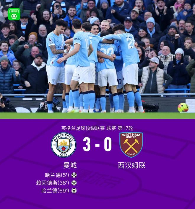 北京時間12月20日,英超聯賽第17輪展開較量,曼城坐鎮主場迎戰西漢姆聯。上半場,哈蘭德傳射建功,賴因德斯小角度勁射破門擴大領先;下半場,西漢姆聯攻勢一度有起色,鮑恩屢造威脅,但哈蘭德抽射破門鎖定勝局。最終,曼城主場3-0完勝西漢姆聯,先賽一場暫登英超榜首。