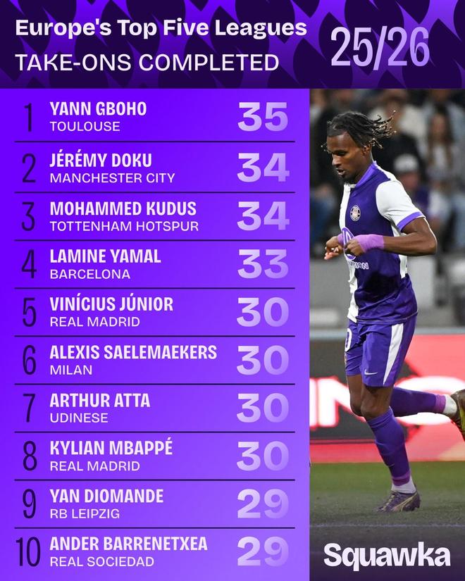 图卢兹前锋格博霍在本赛季12场法甲斩获3球1助攻,据统计,他还完成35次过人,力压多库、库杜斯等人,排在欧洲五大联赛首位。五大联赛本赛季成功过人榜格博霍(图卢兹) 35次多库(曼城) 34次库杜斯(热