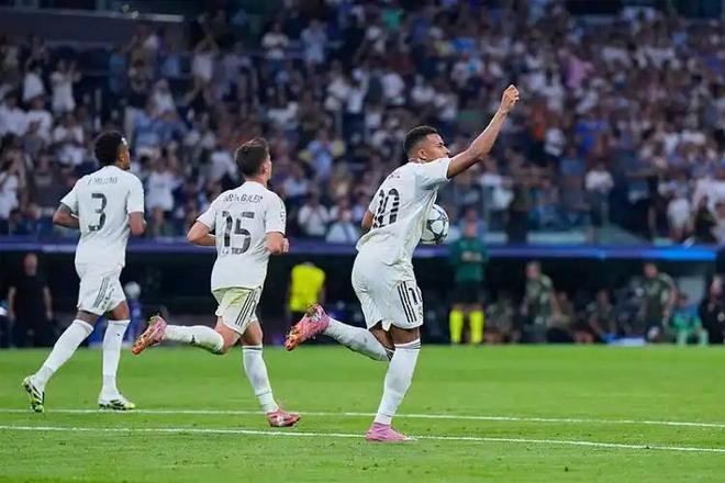 当“小熊”在左路风驰电掣时,姆巴佩会主动内收为巴西人拉开空间;当贝林厄姆前插到禁区时,他又能精准送出倒三角传球。这种无私的踢法,让皇马的进攻体系如同精密的齿轮组,每个环节都严丝合缝。更难得的是,姆巴佩的“退居二线”并非能力下滑的妥协,而是战术智慧的升华。他依然能在关键时刻一剑封喉,比如对阵曼城的欧冠淘汰赛中,他两次看似闲庭信步的跑位,就轻松撕开了对手的防线。在阿隆索的战术板上,姆巴佩既是终结者,也是润滑剂,他的存在让皇马前场的巨星们产生了奇妙的化学反应。