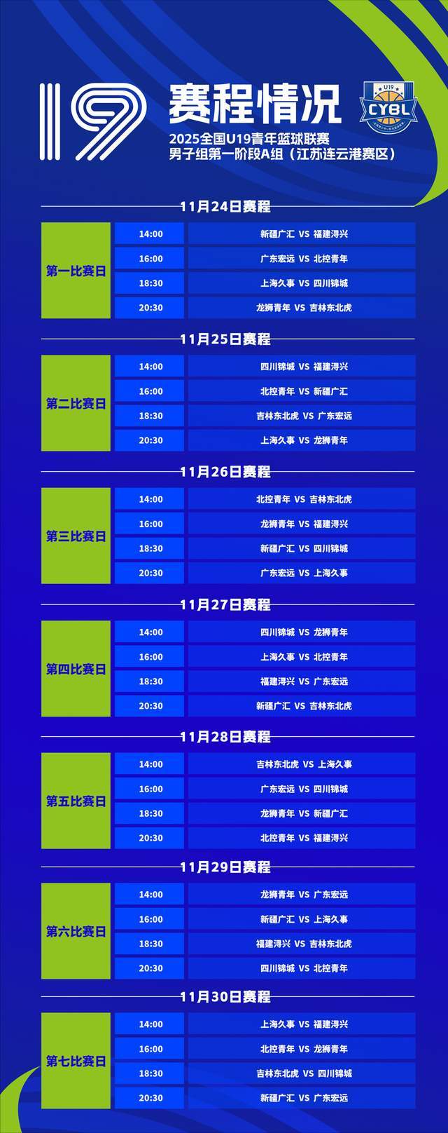 廣東U19男籃的賽程已經出爐,11月24日下午16點,對陣北控,11月25日晚上18:30,對陣吉林。11月26日晚上20:30,對陣上海。11月27日晚上18:30,對陣福建。11月28日下午16點,對陣四川。11月29日下午14點,對陣廣州。11月30日晚上20:30,對陣新疆。