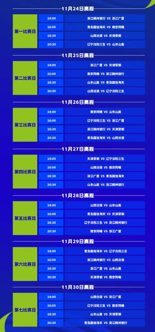 山東U19男籃的賽程已經出爐,11月24日晚上20:30,對陣遼寧。11月25日晚上18:30,對陣青島,11月26日下午14點,對陣南京,11月27日晚上20:30,對陣浙江,11月28日下午14點,對陣山西,11月29日晚上18:30,對陣廣廈,11月30日晚18:30,對陣天津。
