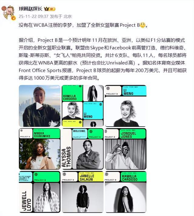 11月22日上午,李夢在社交平臺發視頻官宣加入Project B。視頻中李夢表示,很榮幸加入Project B,也很榮幸能和世界上優秀的人們在一起,希望女籃人越來越好。
