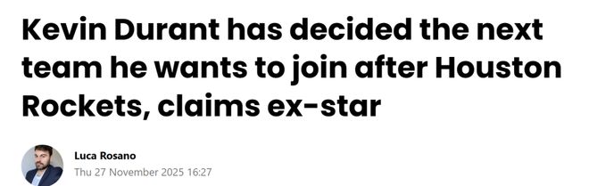 杜蘭特在休賽期被交易至火箭隊,截至目前,這筆交易已取得顯著成效。火箭已躋身西部聯盟頂尖球隊行列,目前以12勝4負的戰績位列西部第四。