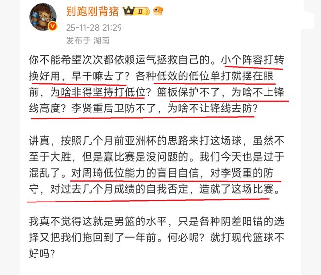 那麼,中國男籃為何會輸給韓國隊呢?對於這個問題,也是有很多人進行瞭討論,CBA名記“別跑剛背豬”認為,中國男籃之所以會輸球,球隊主教練郭士強要負主要責任,是他用人不當,是他戰術有問題,才是導致中國男籃輸球的關鍵原因。