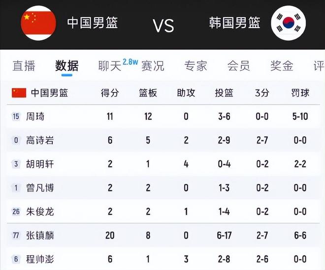 賽後數據基本和現場表現一樣,韓國靠著出色的防守和三分31中14(命中率45%)拿下比賽,李賢重14中9;中國三分26中6(命中率23%)。中國隊雖然總籃板數量占優,但最後2分鐘連丟4個進攻籃板,直接葬送追分機會。更令人揪心的是失誤控制,中國隊15次失誤比對手多5次,直接送給韓國隊18分反擊得分,而罰球線上69.2%對81.2%的命中率差距,又讓分數再次流失。籃板球45-37的優勢未能轉化為勝勢,關鍵時刻接連丟掉前場籃板。