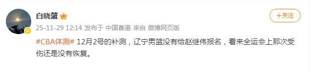 趙繼偉因傷缺席瞭新賽季的CBA體測,且為瞭保險起見,根據媒體人白曉籃報道:“12月2號的補測,遼寧男籃沒有給趙繼偉報名,看來全運會上那次受傷還是沒有恢復。”