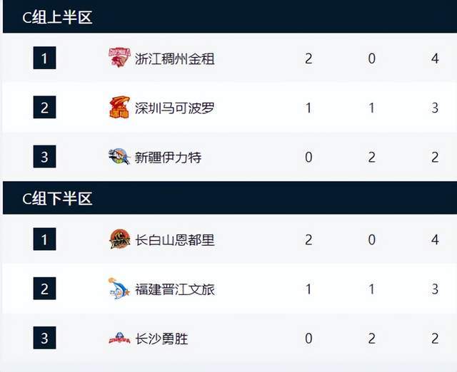 C組上半區,浙江男籃2戰2勝,排名第一,深圳男籃1勝1負,排名第2,新疆男籃0勝2負,排名墊底。C組下半區,吉林男籃2戰2勝,排名第1,福建男籃1勝1負,排名第2,長沙男籃0勝2負,排名墊底。