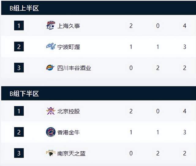 除瞭A組有5支球隊,需要打循環賽來確定前2名外,其他3個小組都是打得分區賽。B組上半區,上海男籃2戰2勝,排名第2,寧波男籃1勝1負,排名第2,四川男籃0勝2負,排名墊底。B組下半區,北控男籃2戰2勝,排名第1,香港金牛1勝1負,排名第2,南京同曦0勝2負,排名墊底。