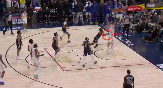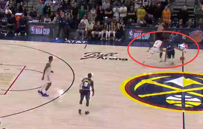 加時賽還剩1分08秒,掘金隊側翼球員小哈達威在爭搶球權時對申京犯規,裁判當時未作吹罰;