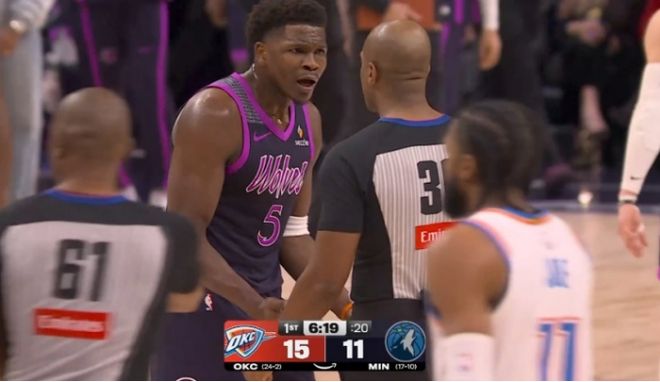 在首節比賽進行到還剩6分19秒時,愛德華茲此前反擊上籃不中,蘭德爾搶到籃板,但被傑倫給搶走球權。此時,森林狼主帥芬奇極為不滿,他認為此前愛德華茲的上籃應該給哨,而裁判沒有任何吹罰。