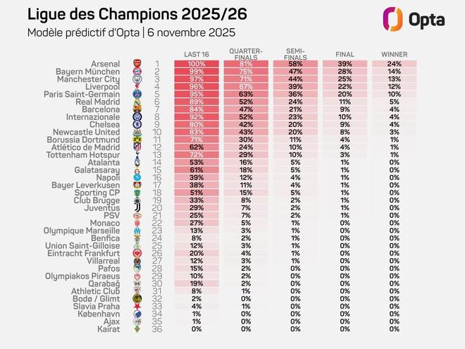 北京时间11月6日,在欧冠联赛阶段第4轮的比赛结束后,Opta预测了36支参加球队晋级16强、1/4决赛、半决赛、决赛以及夺冠的概率。