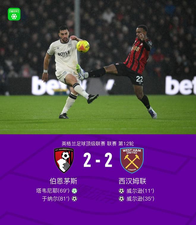 北京時間11月22日,英格蘭足球超級聯賽第12輪展開角逐,伯恩茅斯坐鎮主場迎戰西漢姆聯。比賽中,西漢姆聯率先打破僵局,威爾遜接阿雷奧拉的精準輸送後成功破門,為客隊取得領先。隨後,托迪博送出助攻,威爾遜再次攻破主隊球門,完成個人梅開二度。 易邊再戰,伯恩茅斯展開反撲。塔韋尼耶在點球機會中冷靜施射,為主隊扳回一城。比賽進入尾聲階段,塞內西送出關鍵傳球,於納爾把握機會破門,幫助球隊將比分扳平。最終,雙方以2比2握手言和。