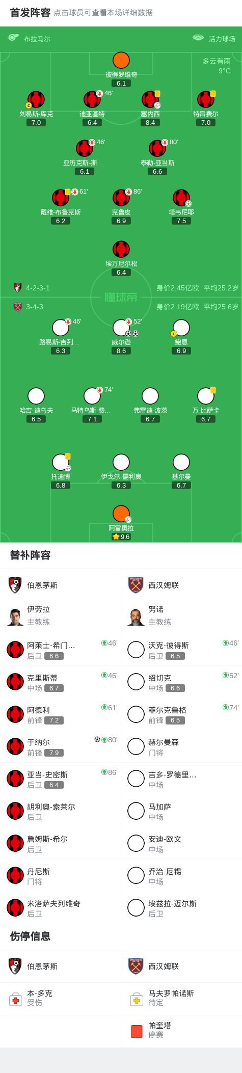 伯恩茅斯2-2西漢姆聯,威爾遜雙響,於納爾扳平比分