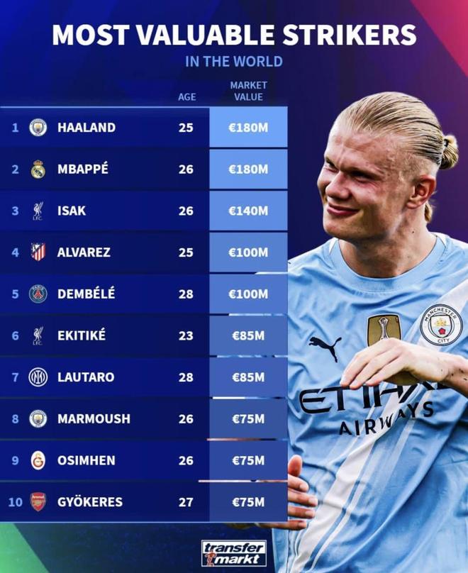 哈蘭德、姆巴佩並列“身價最貴”基本無爭議。哈蘭德過去兩季持續頂級產能與穩定健康,英超與歐冠雙線都有硬數據作背書;姆巴佩轉會皇馬後市場熱度、商業拉力與即戰力疊加,1.8億的錨點仍能解釋。阿爾瓦雷斯的“1億區間”也合理:能打9號/二前鋒/邊鋒,壓迫、銜接與無球跑動為強隊體系增值,身價不僅是進球數。