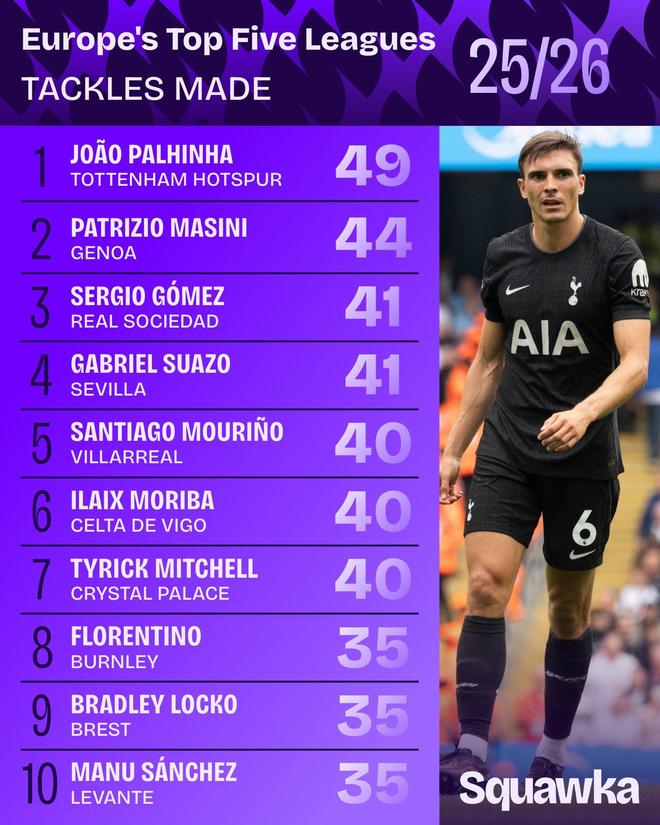 北京時間11月21日,知名數據機構Squawka統計出瞭2025-26賽季歐洲五大聯賽的球員搶斷榜,托特納姆熱刺的中場球星帕利尼亞以49次排名榜首。