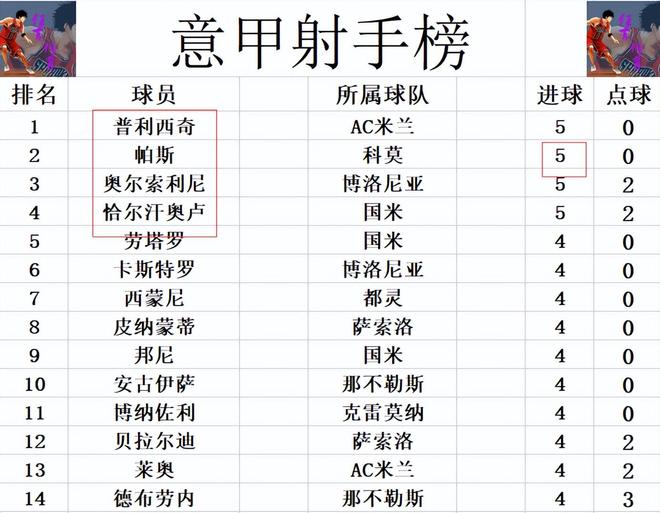 射手榜方面,帕斯今天精彩的倒掛金鉤被撲出無緣破門,這樣的話他就還是和普利希區,奧爾索利尼,恰爾汗奧盧5球並列榜首。勞塔羅,西蒙尼,邦尼,萊奧和德佈勞內等人4球並列第5。